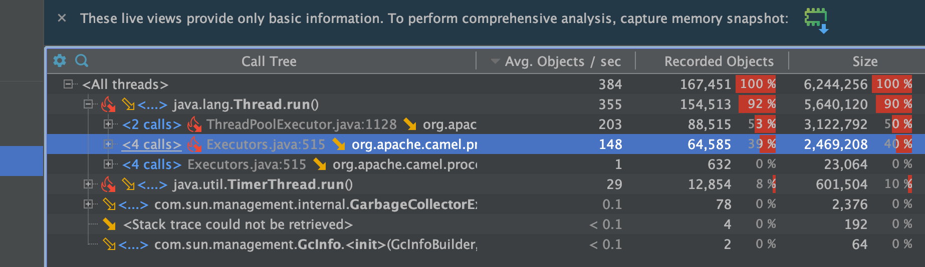 Another related problem is that in Camel 3 due to the modularization then some of the languages (bean, simple, and others) have been changed from being a singleton to prototype scoped. This is one of the biggest problems and we had a Camel user report a problem with thread contention in a high concurrent use-case would race for resolving languages (they are prototype scoped). So you would have this problem, and because the language resolver would query the registry first then Spring would throw NoSuchBeanDefinitionException, and then Camel would resolve the language via its own classpath resolver. So all together this cost performance. We can see this in the screenshots from the profiler in the following.